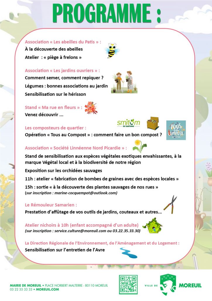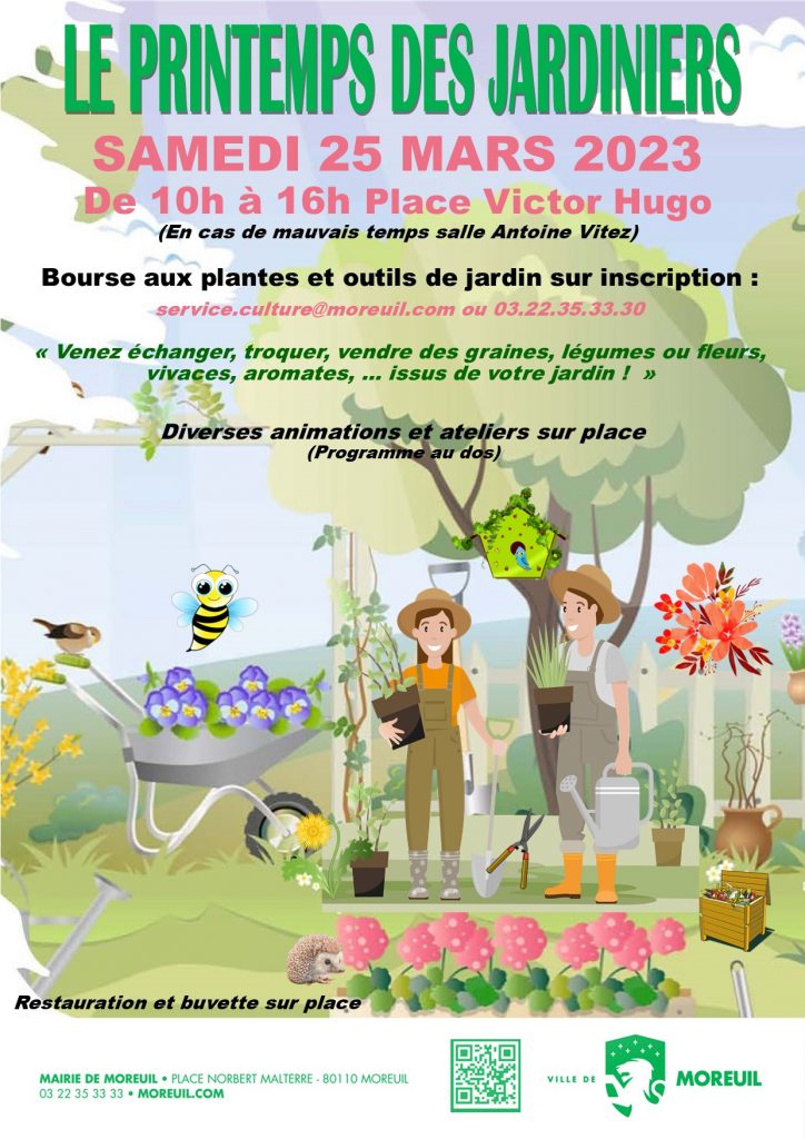 - samedi 25 mars, de 10h00 à 16h00 : Le Printemps des Jardiniers (bourse aux plantes) à Moreuil, sur la place Victor Hugo ou dans la salle des fêtes A. Vitez selon la météo.