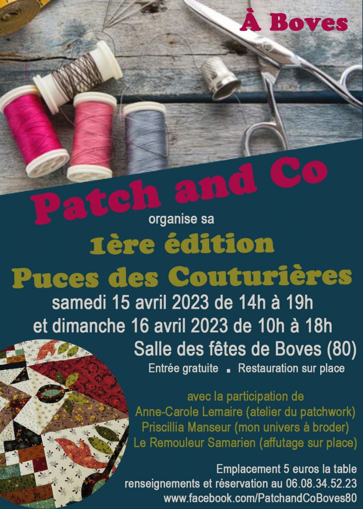 - samedi 15 avril de 14h00 à 19h00 et dimanche 16 avril de 10h00 à 18h00 : Puces des Couturières organisées par Patch and Co, à la salle des fêtes de Boves.